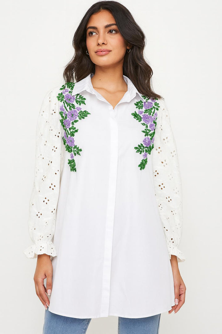 بلوزة بيضاء بأكمام واسعة مزخرفة وتطريز زهري بنفسجي