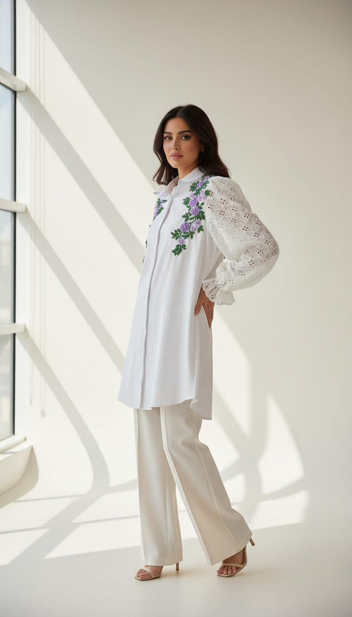 بلوزة باللون الأبيض بأكمام واسعة مزخرفة بثقوب دائرية صغيرة، مزينة بتطريز زهري باللون البنفسجي مع أوراق خضراء على الجانبين الأماميين. الطول متوسط يمتد أسفل الورك، والقياس فري سايز مناسب لمعظم المقاسات.