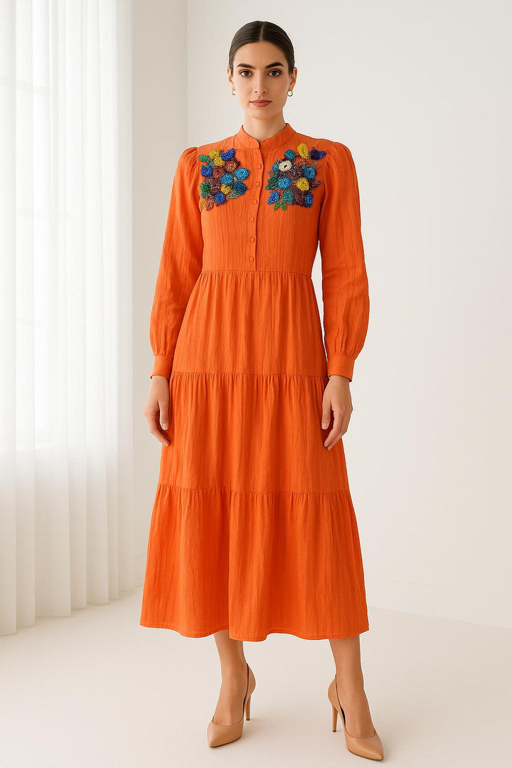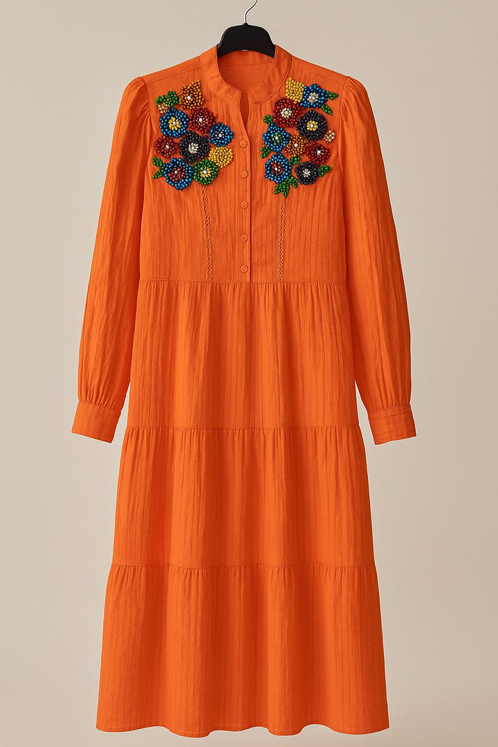 دراعك برتقالية بأكمام طويلة، مزين بتطريز خرز ملون على الصدر، مع أزرار أمامية وتصميم بطبقات أفقية. المقاس فري سايز.