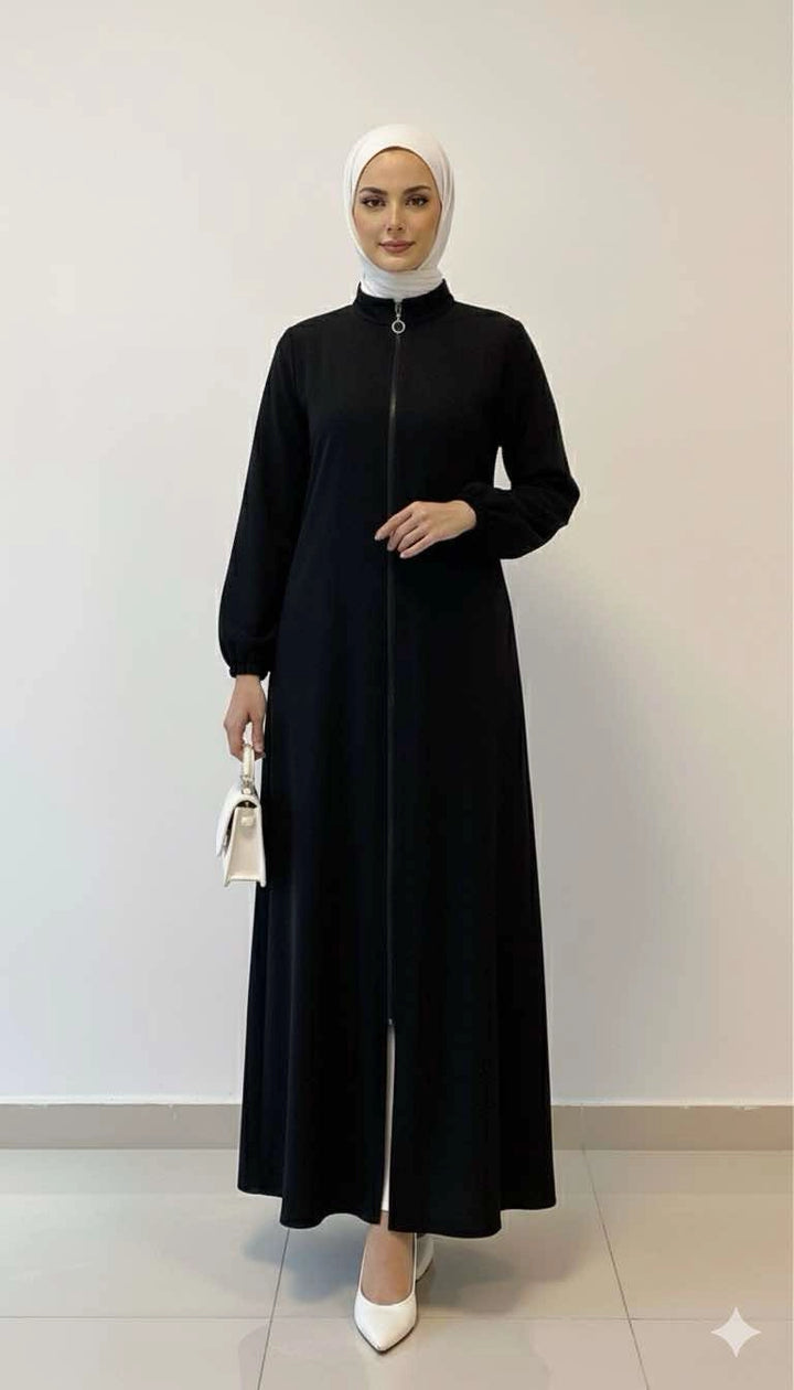 عباية سوداء بسحاب أمامي بتصميم عصري وأنيق